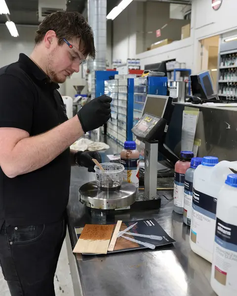 Using a spectrophotometer, the stain colour matching software accurately reads the bare substrate (to be coated) and the target colour from a sample (chart or custom creation) to generate a customized formulation. The tool significantly aids colour mixers in their daily tasks, allowing them to quickly mix accurate shades for any wood-based substrate. During a pilot phase in 2024, users reported substantial time savings, with minimal need for manual adjustments.