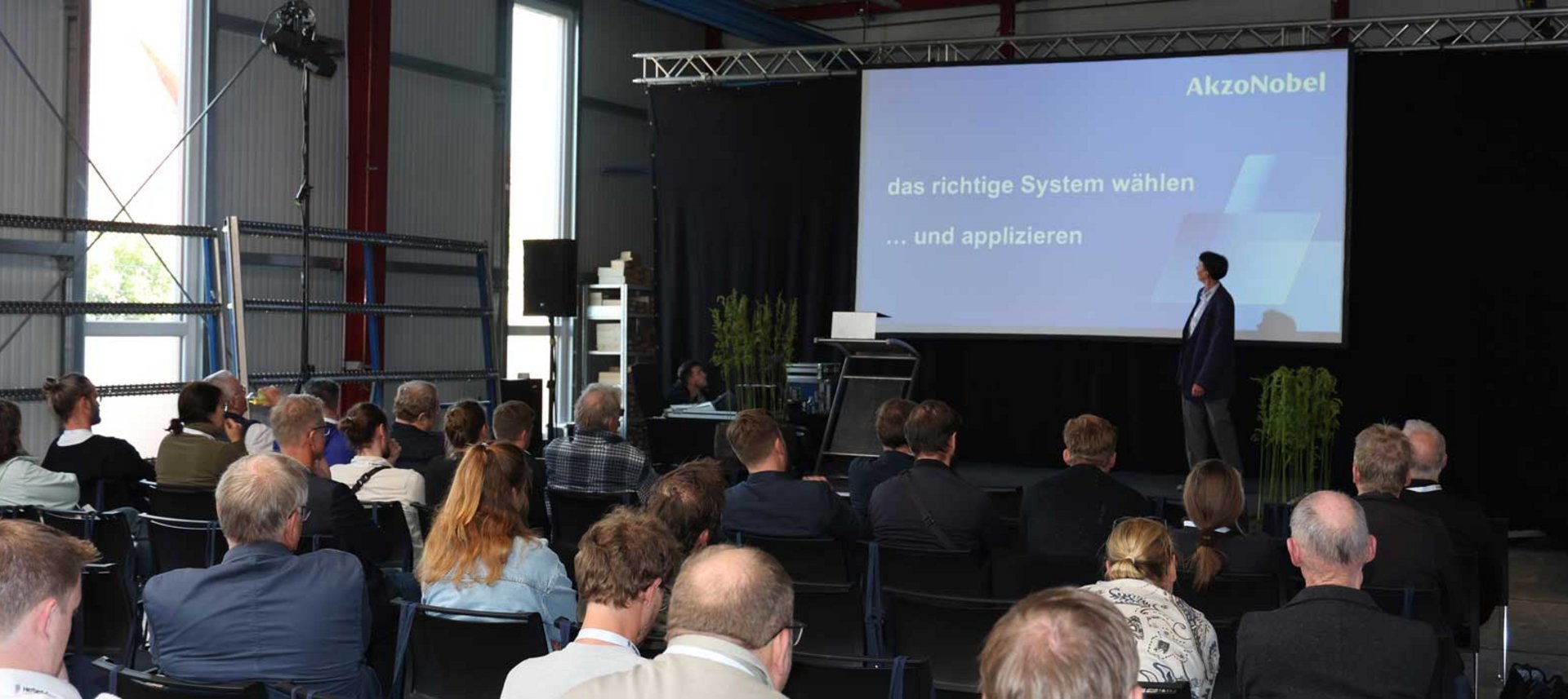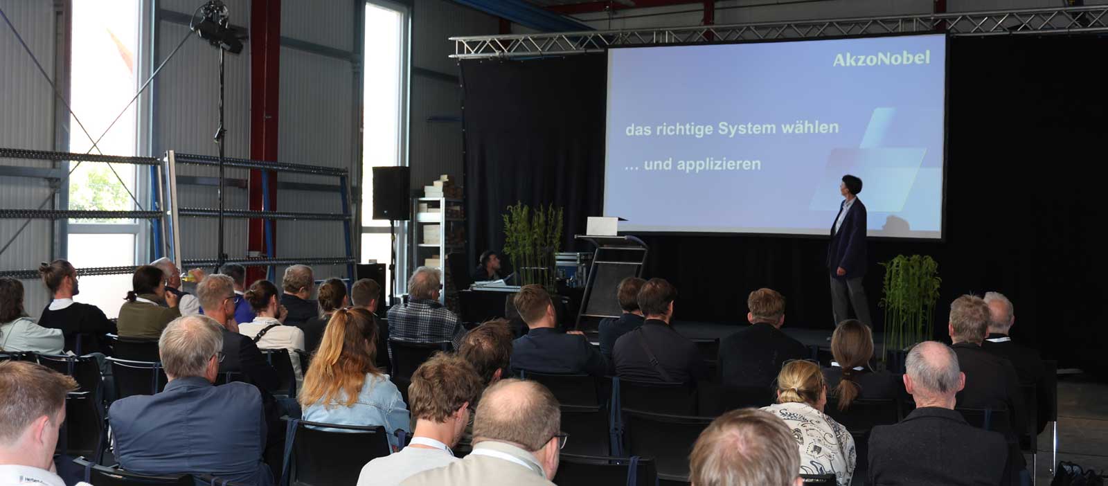 After the tour, the presentation “Paint the Future” by Heike Jänchen from AkzoNobel took center stage. The team from Sikkens Wood Coatings was invited to present at the event as the only wood coatings supplier, sharing their insights with an in-depth presentation exploring wood species to chemical and constructive wood protection. She also discussed the coating systems to be implemented at Herbert-Fenster.