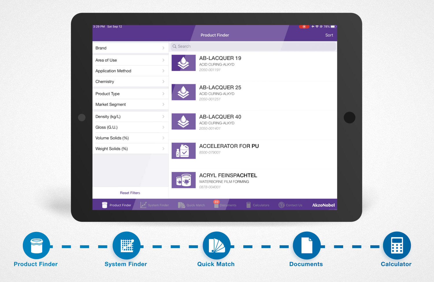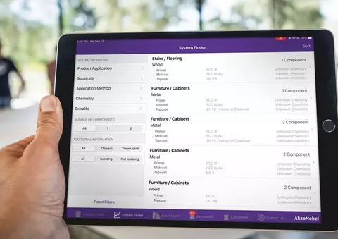 Aplikacja ta obejmuje wyszukiwarkę produktów, integrację z czujnikiem koloru, dokumentację produktową, w tym karty danych technicznych i wiele innych funkcji. Obejrzyj film, aby dowiedzieć się więcej. Jeśli jesteś dystrybutorem AkzoNobel i chcesz użyć tej aplikacji – skontaktuj się z lokalnym przedstawicielem handlowym!
